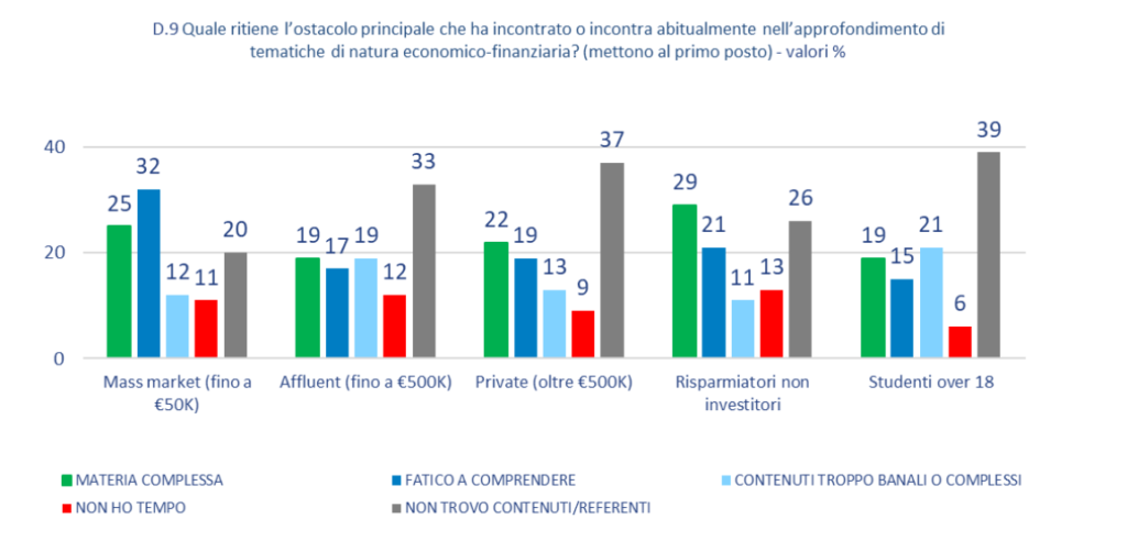 Da una ricerca condotta da Pictet AM su un campione di 5.800 risparmiatori intervistati risulta che il 31% di questi è consapevole di avere un basso livello di conoscenza e desidera migliorare, ma ha difficoltà a reperire informazioni e referenti .